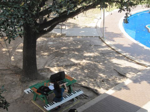 The table in the courtyard has been painted with a piano keyboard where this young woman plays the flute. Quite inspiring to walk up and hear tubas, horns, etc. tootling along … lots of smiles !