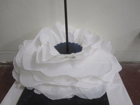 and the tissue paper lying under another heavy metal plate, will convey the concept. Fragile, ephemeral, momentary,transitory, gauzy, or temporary as opposed to hardness, solidness, lasting, enduring, or heaviness. It had to be a freestanding sculpture (i.e. a person must be able to walk around it). Does it succeed?