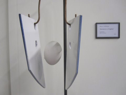 So here is my piece, five feet tall, using three metal objects, and a blown egg, and tissue paper. The title is “Fragility vs Hardness”.