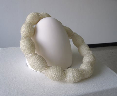 Several sculptures incorporate egg-shaped forms wrapped in crocheted filaments.