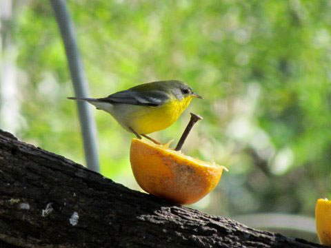 A hum … a buzz … a ripple through the birding community … it has been reported that a Tropical Parula has arrived at Quinta Mazatlan. The gardens at this splendid, restored, adobe house provide shelter and food for migrating birds. Carrina and I brave the cold morning to arrive at 8am when they open the gates and join the shivering group … wandering amid the thickets, hedges, and lawns. Ten o’clock and no bird has shown up to sip from the fresh orange halves adorning the feeders …and then!! there he is!!