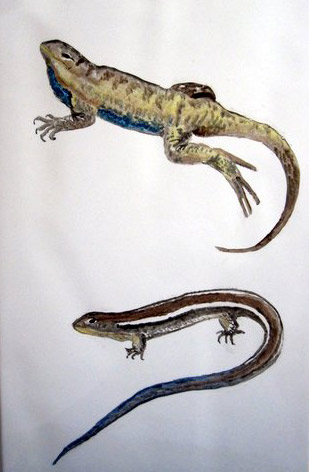 The third tile depicts the American Fence Lizard with his showy blue throat. Below him is the Skink in the juvenile state which means his tail is blue. In the adult the tail is brown.