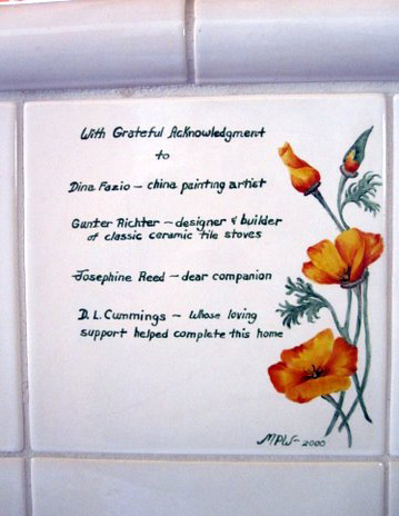 The painted tiles decorating my stove are the wild flowers located on my land in the Sierra’s at 8000 feet. It is a history for the children and grand-children of what particular flowers grew at this elevation in the year 2000.