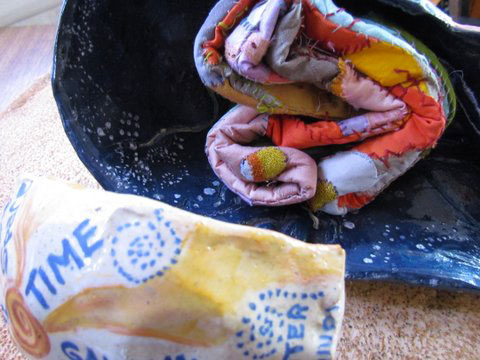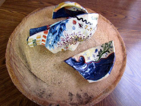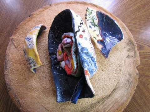 This is a ceramic sculpture of my head, inside and out. The brain is stuffed and embroidered pieces of dyed silk.