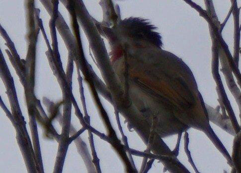 Our Rose Throated Becard reflects the morning of January 20, 2017. He is fluffed up in the gray fog at Estero Llano and is obscured by drifting clouds of mist, yet his patch of rosy feathers shines out at us. We get a brief glimpse and then he is gone to find his breakfast. A poem written in the 1700-1800’s by Issa perfectly describes the park in Texas where we see him. The trees and bushes all have dew drops lined up along their stems and we hear their quiet drip as the mist begins to clear. Lovely morning.