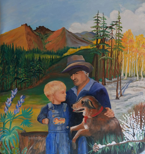 Here is one moment in time caught in a painting of the boy Elias, Poppa Doyle, and the dog, Trouble. Each Spring we see the alpine Lupine bloom. Then the summer meadows turn green, followed by the golden Aspens shedding their leaves as the first Winter snows arrive. Here I celebrate the seasons and the ongoing generations of my family.