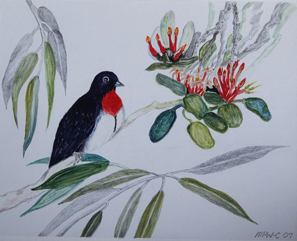 The Mistletoe guy is a tiny mistletoe-feeding specialist (frugivore) who dines on the fruit of the mistletoes which grow on the millions of miles of Eucalyptus trees. He is known for the efficient way he poops on the tree limbs and spreads the “seeds of love” (reference to our habit of kissing under the mistletoe).
