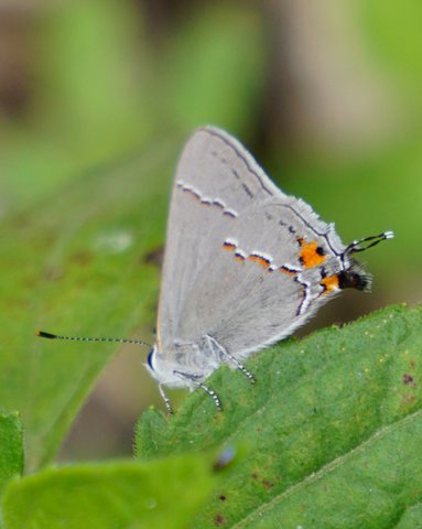 close up of a Hairstreak Butterfly, showing it’s false eyes on its wings.