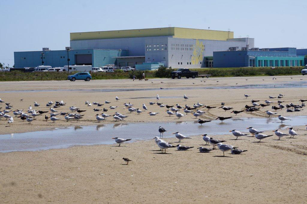 An image of the South Padre Island Convention Center, taken from the beach, looking across a flock of terns and skimmers.