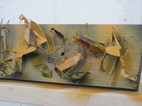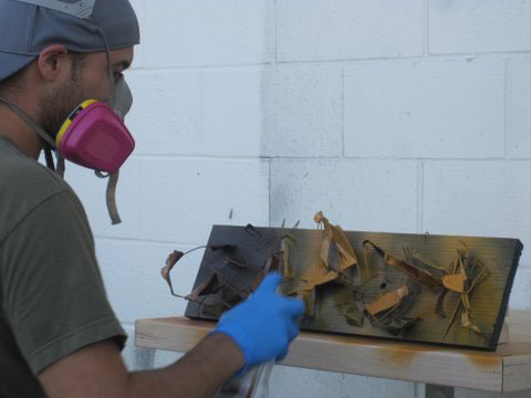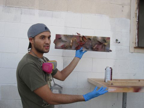 An interesting development in sculpture class … Dr. Pace introduces us to a “graffiti artist” , a young man who is now an undergraduate at South Texas College. His goal in going to art school is to learn to “come off the wall” … this means to leave 2D (painting on a flat surface) and move into the 3D world (painting or constructing objects which have 3 dimensions – called sculpture). To do this he devised a 3D version of his tagging name made by using wire and papier-mache fixed on a board. He has hung up his graffiti status and is now an “aerosol artist” but still a “tagger” (one who tags locations with his name).