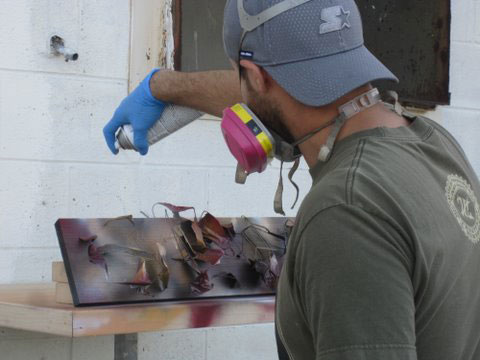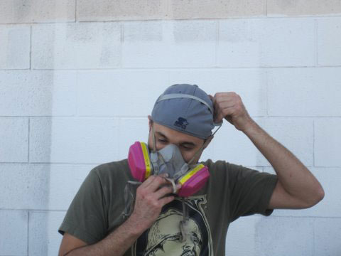 Donning his safety gear he began a series of sweeping moves, waving his hand steadily back and forth, up and down, to cover the letters with paint from a few angles.